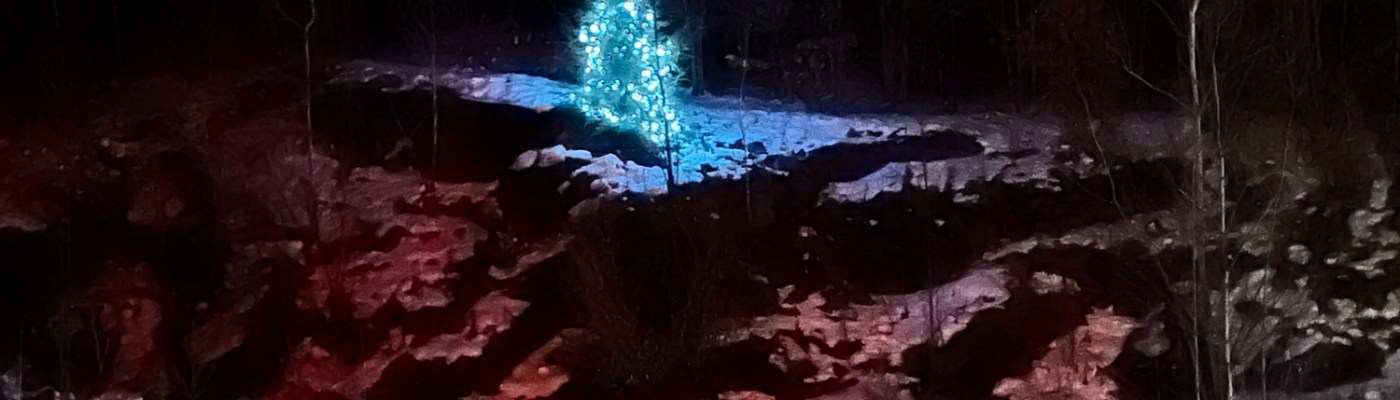 A few weeks ago I caught a glimpse of an evergreen tree that someone had bedecked with lights on the side of 103 heading north. It’s across from a pullover before the intersection of 103 & rte 10. Determined to see it properly I managed to pull over on my way home from a friend’s house last night and get a decent look at it. I can’t tell you how much my heart needed to see this lone tree on the side of a steep embankment lovingly draped with lights. I was able to get a somewhat decent picture of it so that I could post a thank you note in some local FB groups. Much to my surprise the person responsible for this moment of light reached out and I was able to give a more personal note of thanks.